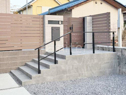 玄関アプローチ階段 床タイル貼り タカショー セラレバンテ 手すり LIXIL アーキレール